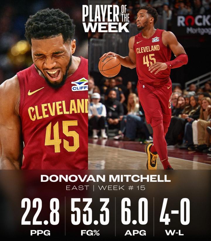现年28岁的米切尔上周则率领骑士取得了4战4胜的成绩,场均他轰下22.8分,命中率高达53.3%,同时他还有场均6次助攻的贡献。