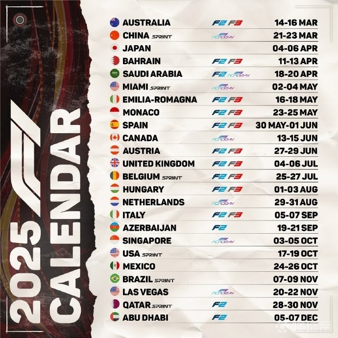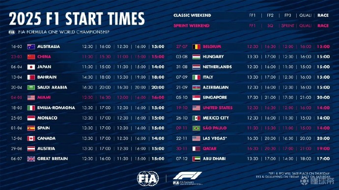 2月4日,国际汽联公布了2025赛季F1世界一级方程式锦标赛24站比赛具体比赛时间。中国大奖赛正赛将于3月23日15点发车。