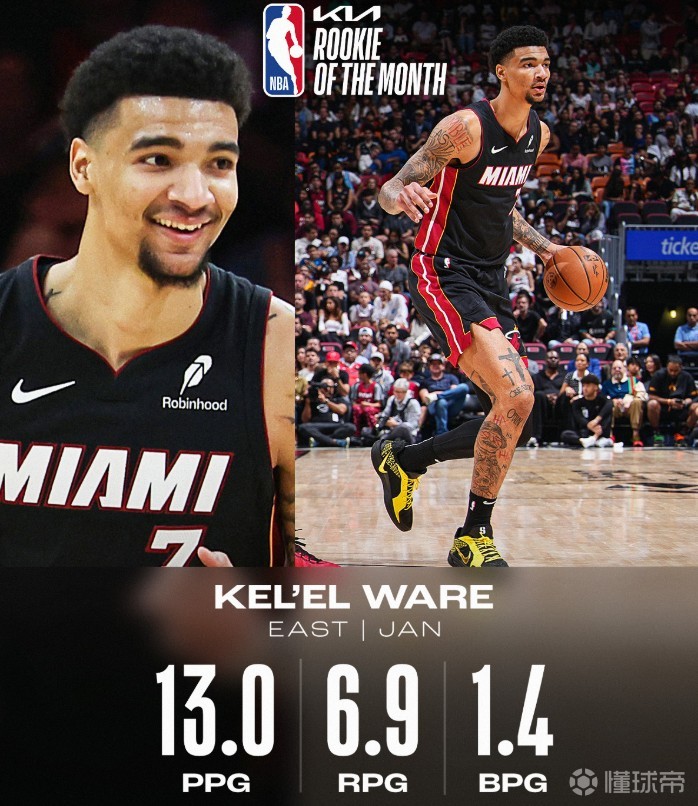 北京时间2月5日,NBA官方宣布,迈阿密热火队中锋凯尔-韦尔和圣安东尼奥马刺队后卫斯蒂芬-卡斯尔分别当选为1月东部和西部最佳新秀。