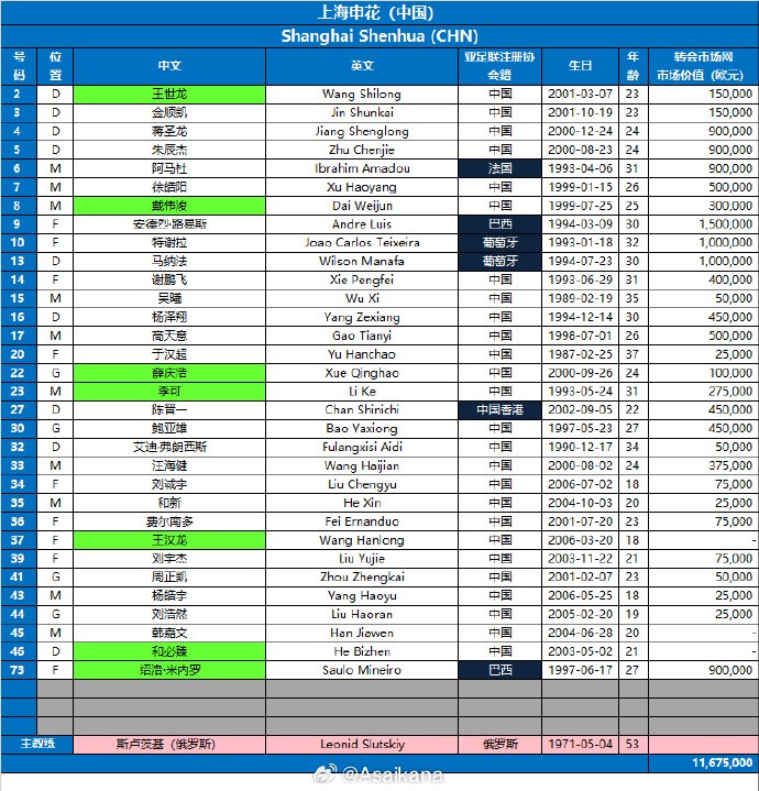 在公布上海申花报名名单的同时,朱艺还对名单的一些情况进行了注解:1、绿色底纹代表对比第2报名窗口,此次报名窗口新增加的球员。2、亚冠精英联赛规定不晚于3月31日前,只要名单不满35人上限,仍允许补报2月4日后新转入的球员。3、由于赛制不同,亚冠精英联赛球衣号码、报名人员不一定与中超完全相同,请注意区分。4、该名单将生效至本赛季亚冠精英联赛结束。