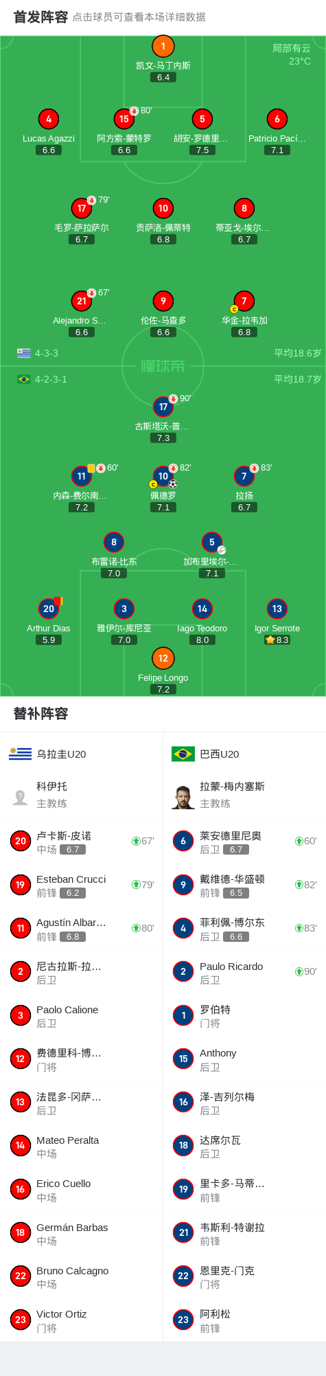 在U20美洲杯决赛中,乌拉圭U20迎战巴西U20。比赛中,巴西U20的Arthur Dias因累计两张黄牌被罚下场。尽管如此,巴西U20依然展现出强大的实力。加布里埃尔-莫斯卡多送出精妙助攻,佩德罗抓住机会,成功攻破对方球门。最终,巴西U20以1比0战胜乌拉圭U20,取得了比赛的胜利。