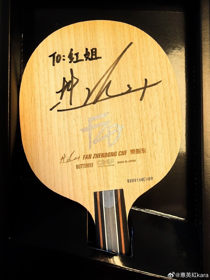2月5日,影视明星惠英红收到樊振东的亲笔签名球拍。