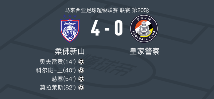 在马来西亚足球超级联赛第20轮的比赛中,柔佛新山坐镇主场迎战皇家警察。比赛中,柔佛新山展现了强大的进攻实力。奥夫雷贡率先为球队打开局面,随后科尔班-王再下一城,进一步扩大了领先优势。赫塞的精彩表现为球队锦上添花,而莫拉莱斯的进球则为比赛画上了完美的句号。最终,柔佛新山以4-0的比分完胜皇家警察,取得了一场酣畅淋漓的胜利。