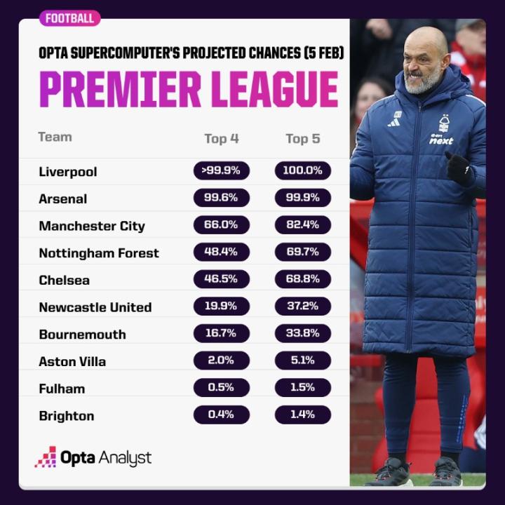 著名数据分析机构Opta列出了英超各队获得欧冠资格的概率,利物浦和阿森纳几乎已经锁定欧冠资格,曼城仍居第三,诺丁汉森林第四。
