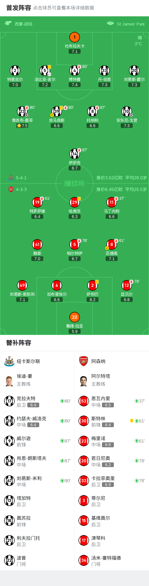 第21分钟,伊萨克怒射击中立柱弹出,墨菲补射破门,纽卡两回合3-0领先