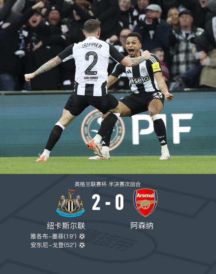 在英格兰联赛杯半决赛的次回合较量中,纽卡斯尔联迎战阿森纳。比赛中,雅各布-墨菲率先为纽卡斯尔联取得进球,随后法比安-舍尔助攻安东尼-戈登再下一城。最终,纽卡斯尔联以2-0战胜阿森纳,两回合总比分4-0,成功晋级。