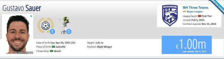 德转显示,古斯塔沃是自由身加盟武汉三镇,目前球员的身价为100万欧元。