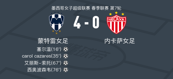 蒙特雷女足4-0大胜内卡萨女足,西奥波森韦、艾丽斯-索托破门