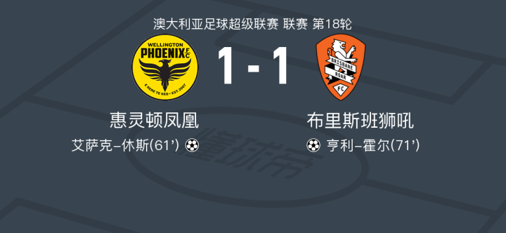 惠灵顿凤凰1-1布里斯班狮吼,艾萨克-休斯破僵,亨利-霍尔扳平比分