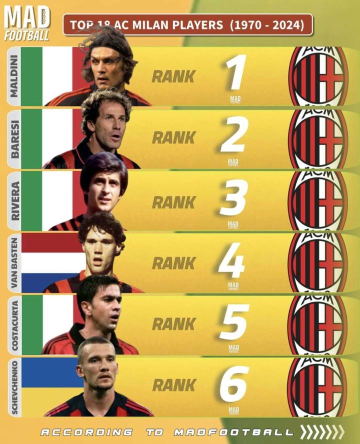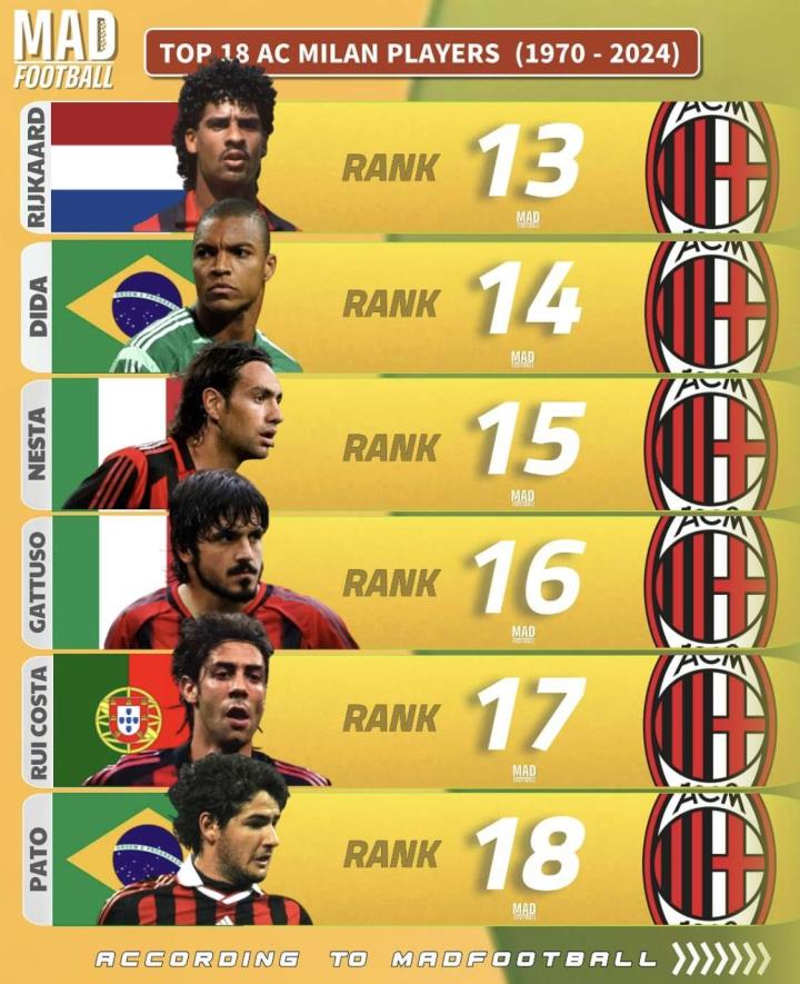 《MADFootball》AC米兰(1970-2024)TOP18球星排名,排名规则不清晰的前提下总是有各自理解各种争议,如果从职业生涯履历和成就荣誉等等综合来对比,这份排名存在的争议包括不限于: -科斯塔库塔排在第5名太高了。 -卡卡只排在第8太低了,起码进入前5名。 -伊布排第12也有点高。 -迪达(14)、鲁伊科斯塔(17)、帕托(18)入围都值得商榷,尤其是帕托哪有资格进入。 -乔治维阿、马萨罗、博班、比埃尔霍夫、卡福等等够不够入围。