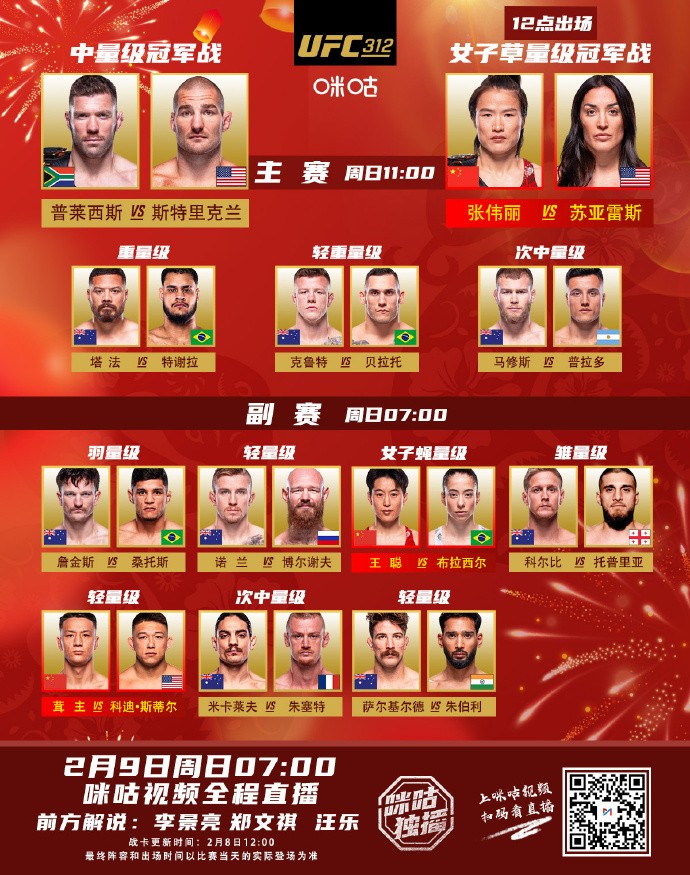 除了张伟丽外,在副赛中还有2位中国选手出战。其中茸主将在轻量级对阵美国选手斯蒂尔,王聪将在女子蝇量级对阵巴西选手布拉西尔。