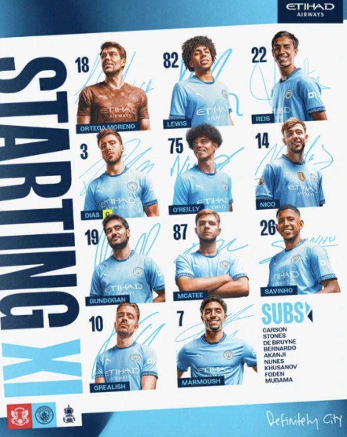 18-奥尔特加、82-刘易斯、22-维托尔-雷斯、3-鲁本-迪亚斯、75-奥赖利、14-尼科-冈萨雷斯、19-京多安、87-麦卡蒂、26-萨维尼奥、10-格拉利什、7-马尔穆什