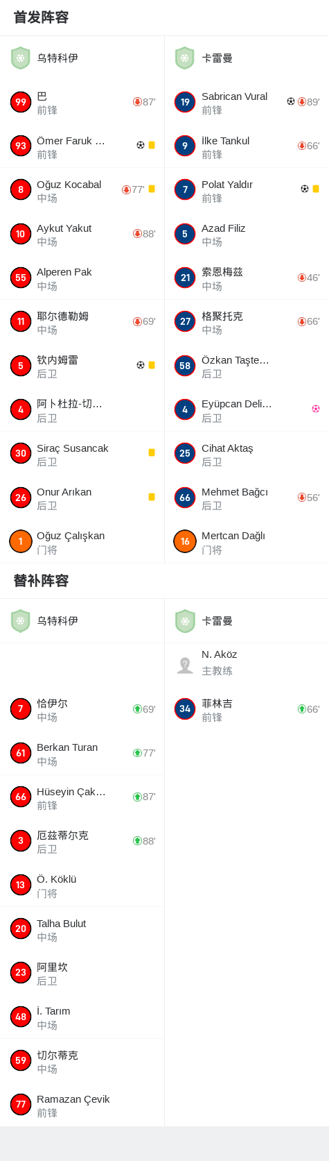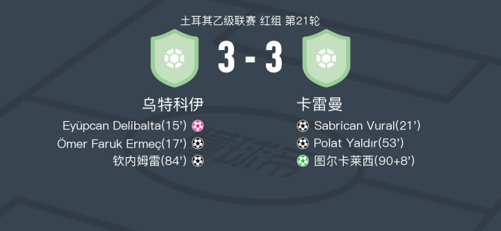 在土耳其乙级联赛红组第21轮的比赛中,乌特科伊坐镇主场迎战卡雷曼。比赛一开始,卡雷曼的Eyüpcan Delibalta不慎将球打入自家球门,乌特科伊幸运取得领先。随后,乌特科伊的Ömer Faruk Ermeç再下一城,扩大了领先优势。然而,卡雷曼迅速做出回应,Sabrican Vural为球队扳回一球。 比赛进入下半场后,卡雷曼的Polat Yaldır成功破门,将比分扳平。比赛接近尾声时,乌特科伊的钦内姆雷再次为主队取得领先。然而,在补时阶段,卡雷曼的图尔卡莱西通过点球机会将比分定格在3-3。最终,双方激战成和,各取一分。