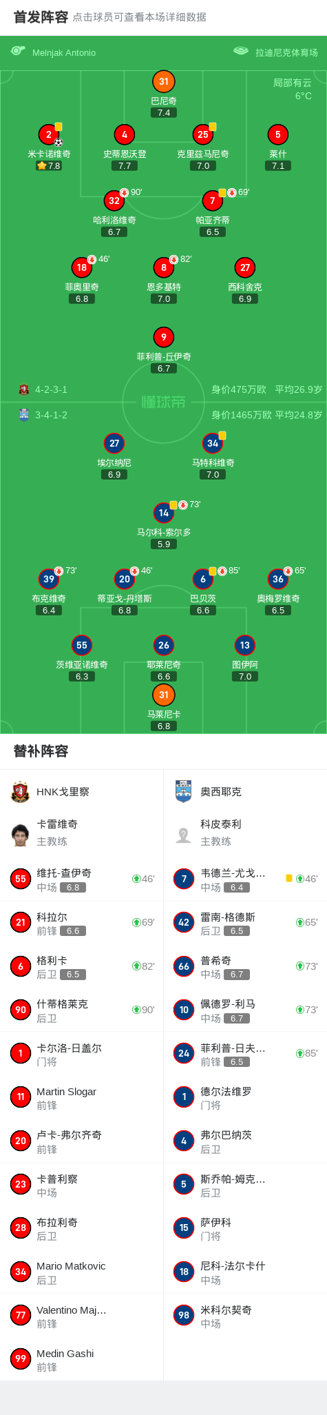 HNK戈里察1-0奥西耶克,米卡诺维奇一击制胜战报bot @懂球帝2025-02-08 23:58在克罗地亚足球联赛第21轮的较量中,HNK戈里察坐镇主场迎战奥西耶克。比赛中,HNK戈里察的米卡诺维奇成功破门,为球队取得领先。最终,HNK戈里察以1-0战胜奥西耶克,取得了本场比赛的胜利。点击查看本场比赛详细数据>>点击查看克联完整积分榜>>精彩瞬间第66分钟,HNK戈里察球员米卡诺维奇打入一球。 球队阵容 技术统计 展开更多
