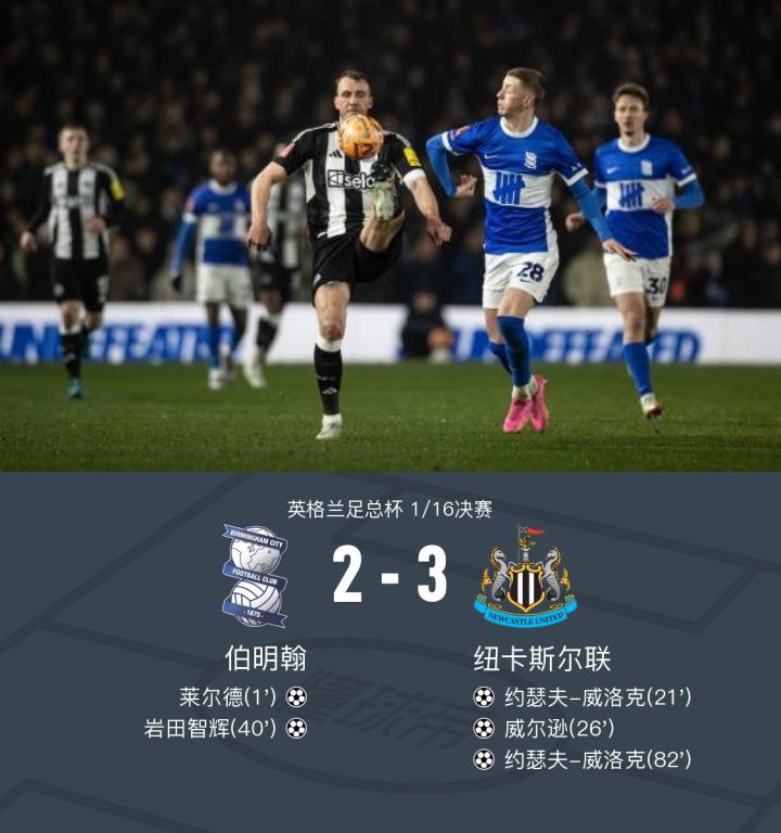 在英格兰足总杯1/16决赛中,伯明翰迎战纽卡斯尔联。比赛伊始,伯明翰的凯希-安德森送出精妙助攻,莱尔德迅速破门,为球队取得领先。纽卡斯尔联不甘示弱,奥苏拉接连两次送出助攻,先是帮助约瑟夫-威洛克扳平比分,随后又助攻威尔逊反超。伯明翰的岩田智辉随后打入一球,将比分再次扳平。比赛接近尾声时,纽卡斯尔联的肖恩-朗斯塔夫助攻约瑟夫-威洛克完成梅开二度,帮助球队锁定胜局。最终,纽卡斯尔联以3-2险胜伯明翰。