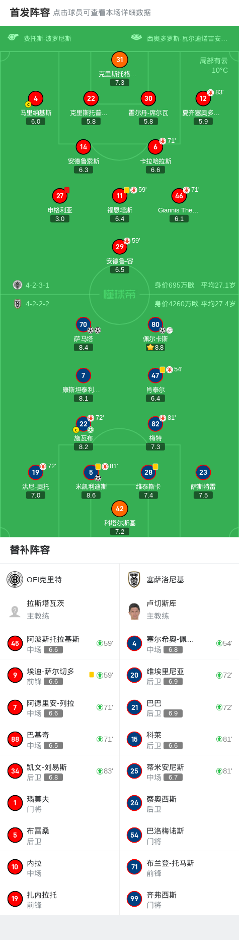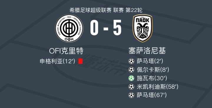 塞萨洛尼基5-0血洗OFI克里特,萨马塔两球,施瓦布点射破门