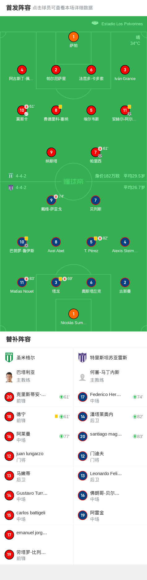 第45分钟,特里斯坦苏亚雷斯球员巴勃罗-鲁伊斯打入一球。