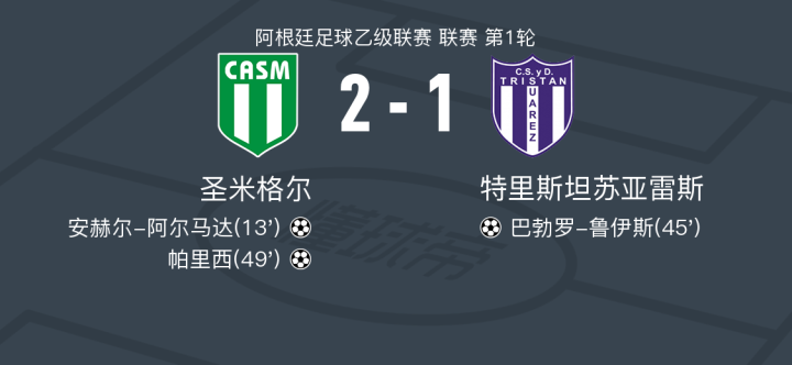 在阿根廷足球乙级联赛的首轮比赛中,圣米格尔坐镇主场迎战特里斯坦苏亚雷斯。比赛中,圣米格尔的安赫尔-阿尔马达在队友莫斯卡的助攻下率先破门,为主队取得领先。随后,特里斯坦苏亚雷斯的巴勃罗-鲁伊斯扳平比分,展现了客队的顽强斗志。下半场,圣米格尔的帕里西再度为主队建功,帮助球队锁定胜局。最终,圣米格尔以2-1战胜特里斯坦苏亚雷斯,取得了本赛季的开门红。