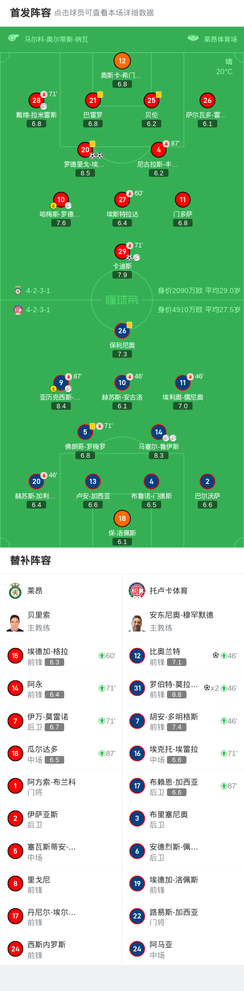 第60分钟,托卢卡体育球员亚历克西斯-维加助攻罗伯特-莫拉莱斯打入一球。