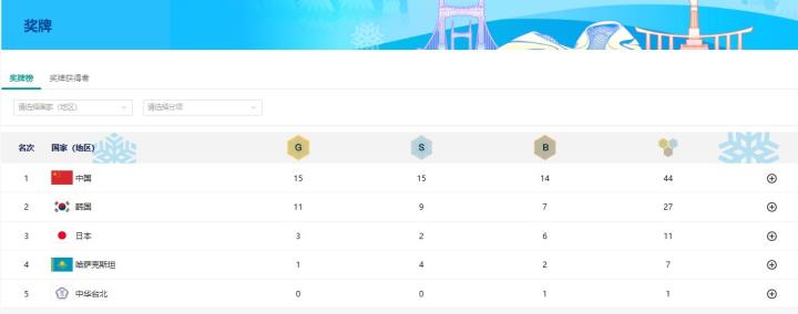 亚冬会第2日后奖牌榜:中国队共15金15银14铜,继续位居第一