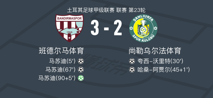 在土耳其足球甲级联赛第23轮的较量中,班德尔马体育坐镇主场迎战尚勒乌尔法体育。比赛中,班德尔马体育的马苏迪表现出色,上演了帽子戏法,成为球队获胜的关键人物。尚勒乌尔法体育方面,夸西-沃里特和哈桑-阿贾尔各自为球队贡献了一粒进球。最终,班德尔马体育以3-2险胜尚勒乌尔法体育,取得了本场比赛的胜利。