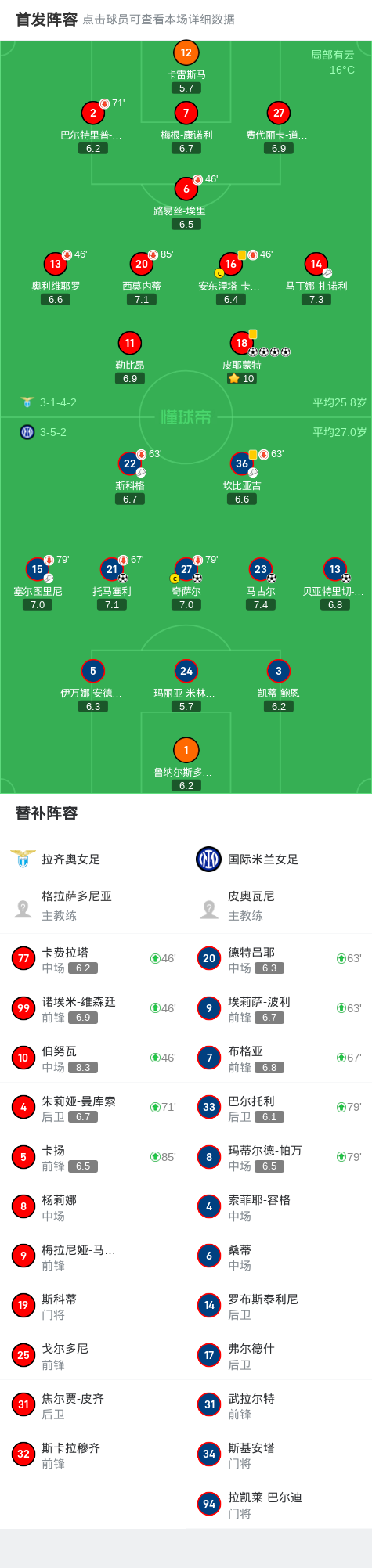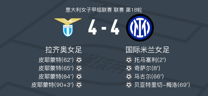 拉齐奥女足4-4国米女足,皮耶蒙特大四喜,杨莉娜替补未登场