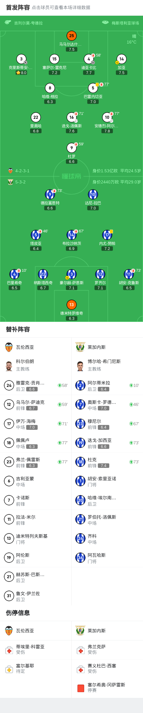 在西班牙足球甲级联赛第23轮的比赛中,瓦伦西亚坐镇主场迎战莱加内斯。比赛中,瓦伦西亚展现了出色的进攻能力。首先,安德烈-阿尔梅达送出精妙助攻,克里斯蒂安-莫斯克拉成功破门,为球队首开纪录。随后,迭戈-洛佩斯也贡献了一次精彩的助攻,帮助迪亚卡比再下一城。最终,瓦伦西亚以2-0的比分战胜莱加内斯,取得了本场比赛的胜利。