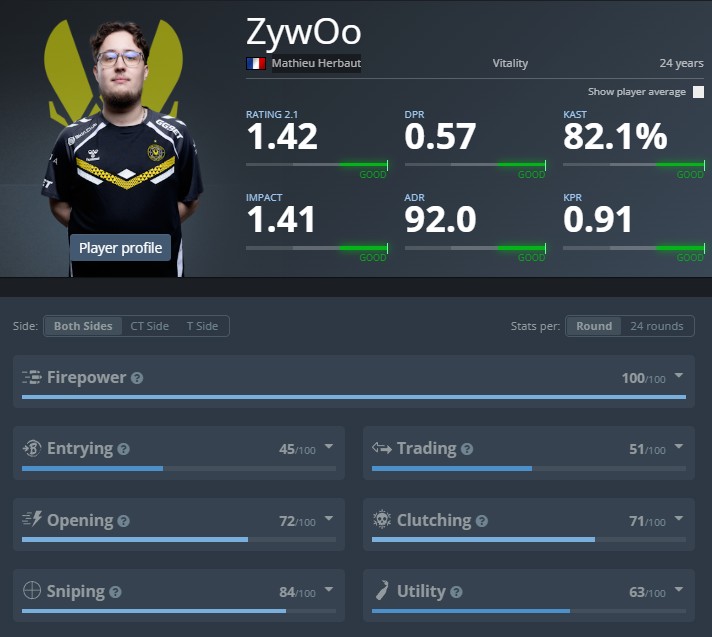 ZywOo在此次卡托赛事中火力值被评为100分,各项数据均处于全部选手前列。