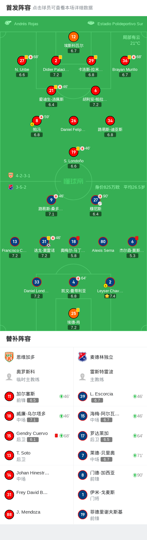在哥伦比亚足球甲级联赛春季联赛的较量中,恩维加多坐镇主场迎战麦德林独立。比赛中,麦德林独立的迭戈-莫雷诺在穆尼斯的助攻下成功破门,为球队取得领先。比赛过程中,麦德林独立的杰尔森-莫斯克拉和奥梅尔-马丁内斯分别被罚下,场上局势一度紧张。恩维加多的Gendry Cuervo也因犯规被红牌罚下。最终,麦德林独立凭借迭戈-莫雷诺的进球,以1-0小胜恩维加多,取得了比赛的胜利。