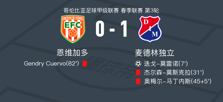 麦德林独立1-0恩维加多,迭戈-莫雷诺助球队取胜