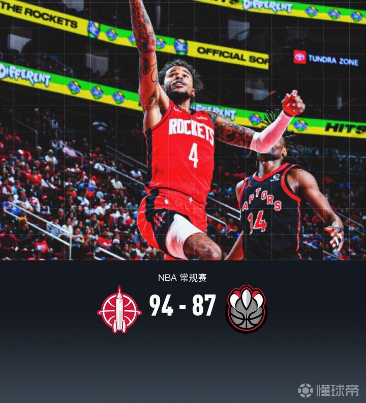 第四节火箭杰伦-格林拿下9分,猛龙斯科蒂-巴恩斯拿下9分,最终火箭94-87战胜猛龙