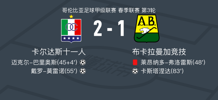 在哥伦比亚足球甲级联赛春季联赛第3轮的较量中,卡尔达斯十一人坐镇主场迎战布卡拉曼加竞技。比赛中,卡尔达斯十一人的迈克尔-巴里奥斯在罗哈斯的助攻下率先破门,帮助球队取得领先。随后,布卡拉曼加竞技的莱昂纳多-弗洛雷斯被罚下场,给球队带来不小的压力。卡尔达斯十一人乘胜追击,胡安-奎斯塔助攻戴罗-莫雷诺再下一城,扩大了领先优势。尽管布卡拉曼加竞技的卡斯塔涅达为球队扳回一球,但最终未能改变比赛结果。卡尔达斯十一人以2-1的比分战胜布卡拉曼加竞技,取得了本场比赛的胜利。