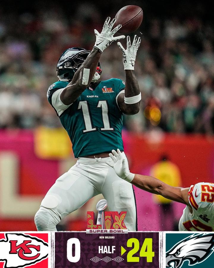 北京时间2月10日,第59届NFL超级碗将在新奥尔良凯撒超级穹顶体育场打响,冲击三连冠的堪萨斯城酋长队与费城老鹰队争夺冠军。上半场比赛,老鹰以24-0领先酋长。马霍姆斯两次传球被抄截,老鹰全部转化为得分。