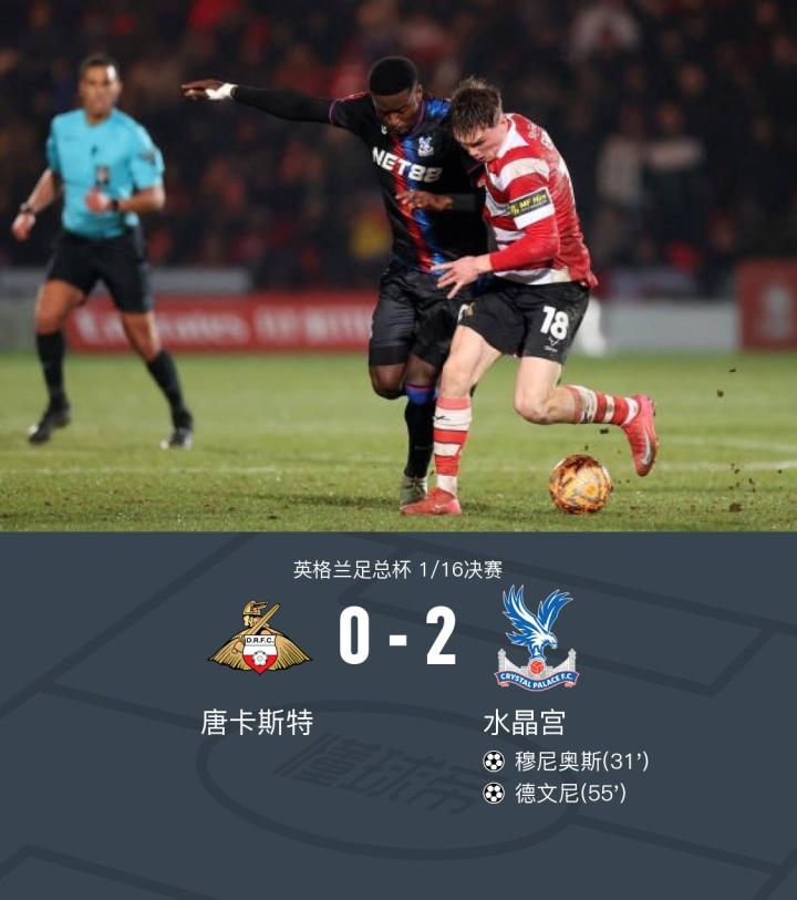 在英格兰足总杯1/16决赛中,唐卡斯特迎战水晶宫。比赛中,水晶宫的穆尼奥斯率先为球队取得进球,随后,德文尼在威尔-休斯的助攻下再下一城。最终,水晶宫以2比0战胜唐卡斯特,成功晋级下一轮。