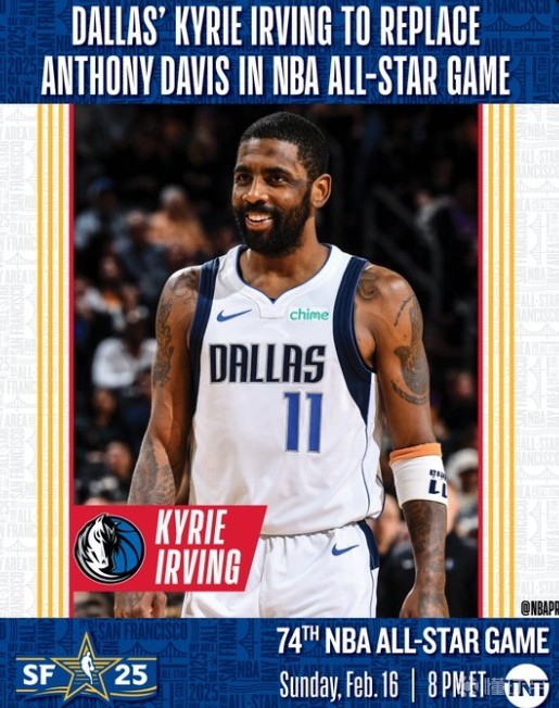 北京时间2月11日,NBA官方宣布,独行侠后卫凯里-欧文将顶替戴维斯第9次入选全明星。