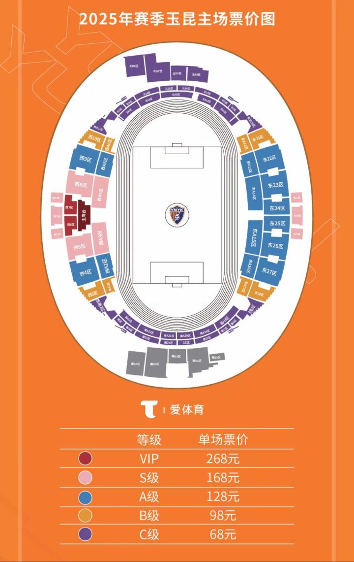 2025赛季云南玉昆主场票价:VIP等级,268元;S级,168元;A级,128元;B级,98元;C级,68元。