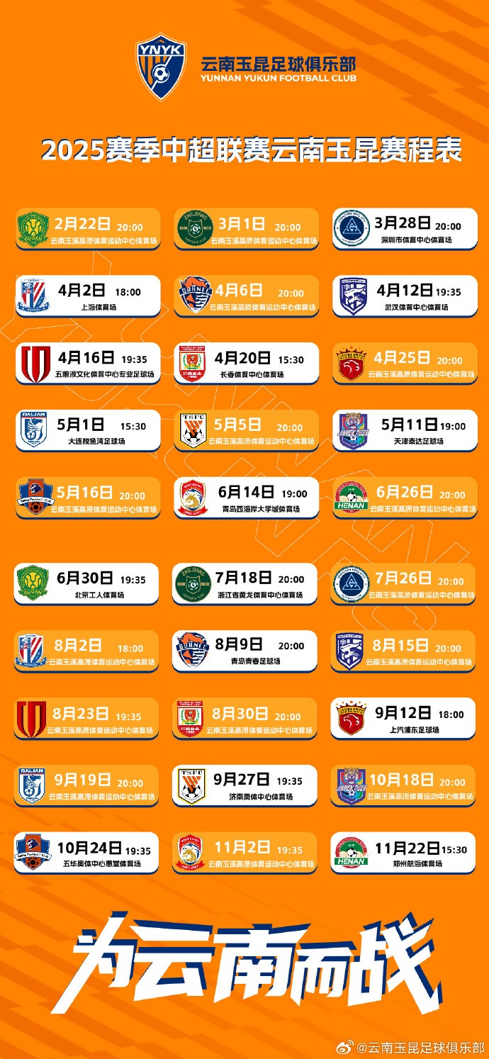按照赛程计划,2025赛季中超联赛前两轮,云南玉昆均是主场作战。中超第1轮,2月22日晚20点,云南玉昆将主场迎战北京国安。中超第2轮,3月1日晚20点,云南玉昆将主场对阵浙江队。
