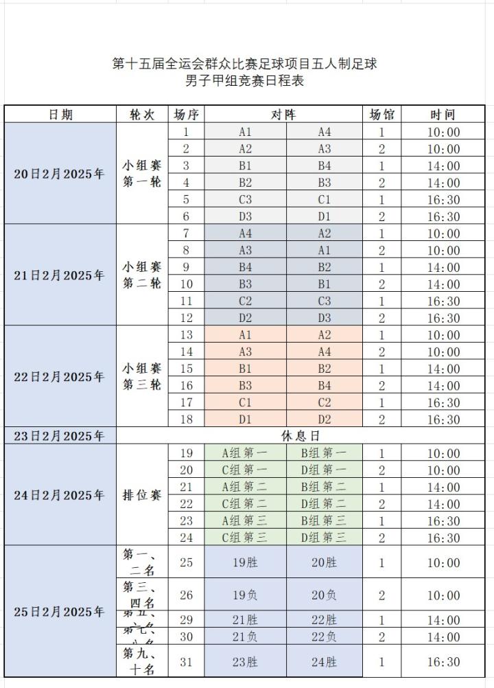 附件:第十五届全运会群众比赛足球项目五人制足球男子甲组竞赛日程表(下图)