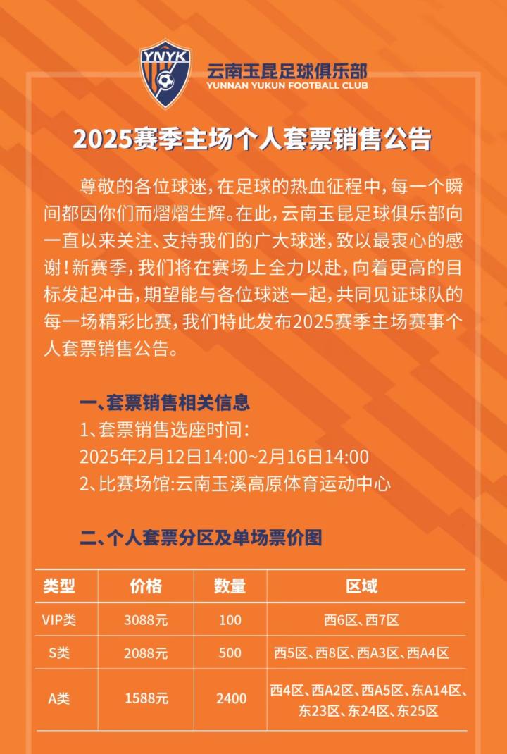 尊敬的各位球迷,在足球的热血征程中,每一个瞬间都因你们而熠熠生辉。在此,云南玉昆足球俱乐部向一直以来关注、支持我们的广大球迷,致以最衷心的感谢!新赛季,我们将在赛场上全力以赴,向着更高的目标发起冲击,期望能与各位球迷一起,共同见证球队的每一场精彩比赛,我们特此发布2025赛季主场赛事个人套票销售公告。