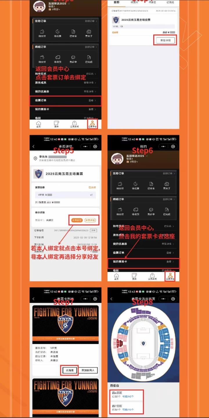 绑定套票完成后进入<我的套票卡>选择对应套票卡点击<选择座位>即可进行在线选座(在线选座截止时间前,可多次选座或更换座位,最终以系统截止时间的最后选择为准)。