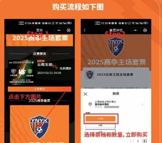 在套票销售期间进入<云南玉昆足球俱乐部>小程序,点击<票务>按需购买2025赛季主场套票。