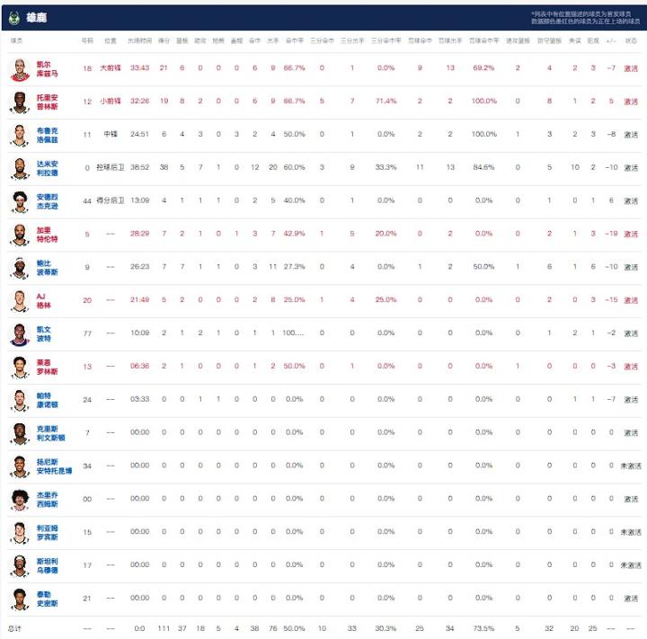 密尔沃基雄鹿利拉德38分5板7助10失误,库兹马21分6板,普林斯19分7板2助;