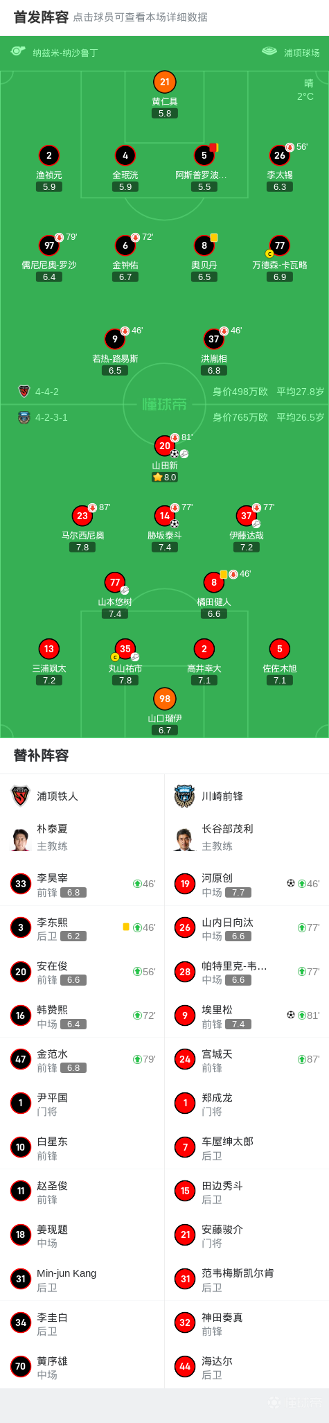 北京时间2月11日亚足联冠军精英联赛 联赛阶段 第7轮,浦项铁人对阵川崎前锋。川崎前锋山田新传射,胁坂泰斗、河原创、埃里松分别破门,浦项铁人阿斯普罗波塔米蒂斯被罚下。最终川崎前锋4-0战胜十人浦项铁人提前出线。