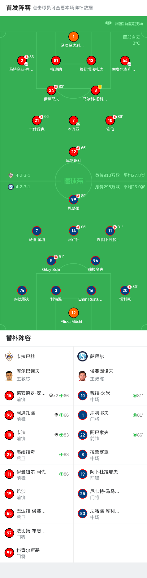 下半场补时第3分钟,卡拉巴赫球员莱安德罗-安德拉德助攻阿洪扎德打入一球。