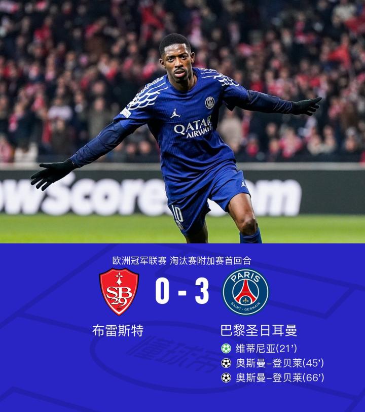 在欧洲冠军联赛淘汰赛附加赛的首回合较量中,巴黎圣日耳曼展现了强大的进攻实力。上半场登贝莱造米卢禁区手球,维蒂尼亚点射命中,半场尾声登贝莱内切打近角得手。下半场登贝莱禁区内折射破门完成双响,最终巴黎3-0客胜布雷斯特。