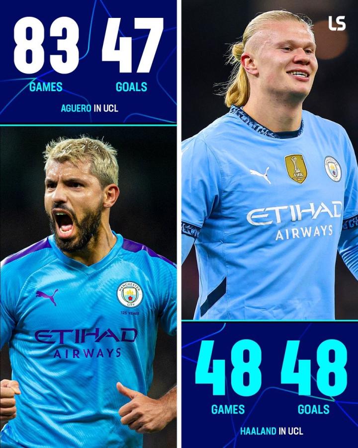 在与皇家马德里的欧冠比赛中打入一球后,曼城前锋哈兰德欧冠生涯已打入48球,超过了曼城传奇阿圭罗的欧冠生涯进球数。