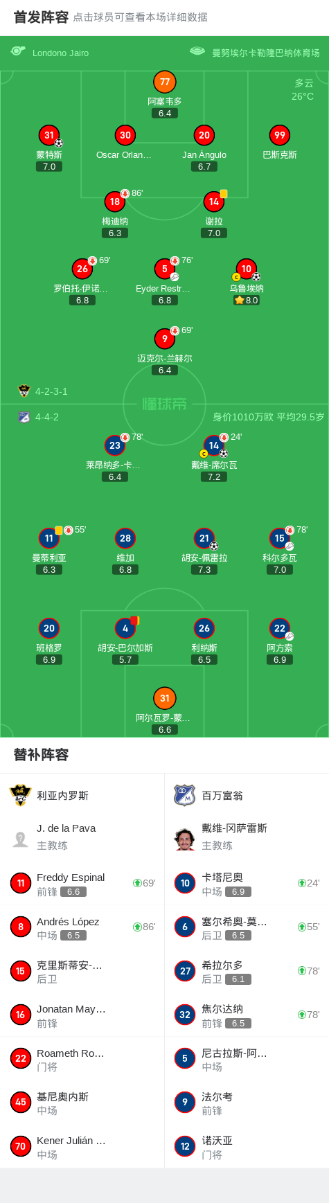 第10分钟,利亚内罗斯球员Eyder Restrepo助攻蒙特斯打入一球。