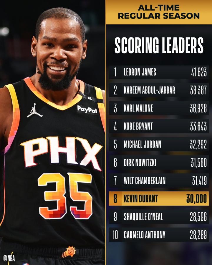 36岁杜兰特达成3万分里程碑,成为NBA历史上第8位3万分先生