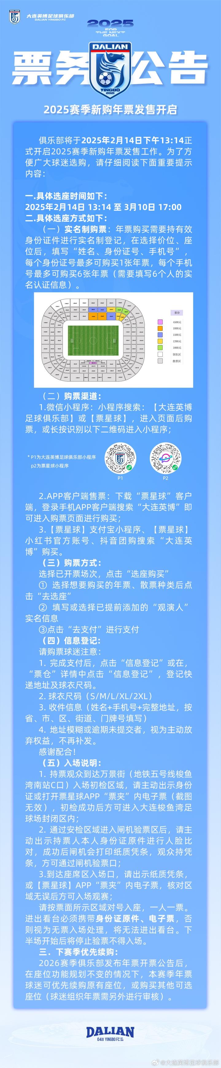 爱你一生一世?大连英博年票定于情人节2月14日13:14开售ZeroTsu_02 @懂球帝2025-02-12 16:19北京时间2月12日,大连英博官方发布新赛季年票票务公告,2025赛季大连英博年票定于情人节2月14日13:14开售。大连英博年票分为1000元、1200元、1500元、1800元与4500元五个档位。球迷可在大连英博足球俱乐部小程序或者票星球小程序进行购票。相关阅读:【大连英博公布新赛季主场票价:年票最低699元,散票最低60元】展开更多