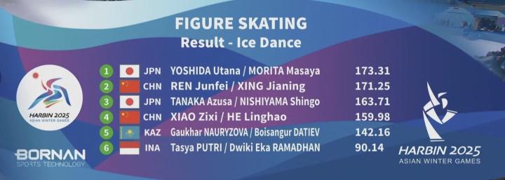 亚冬会花滑冰舞:任俊霏/邢珈宁拿到银牌,日本组合夺金